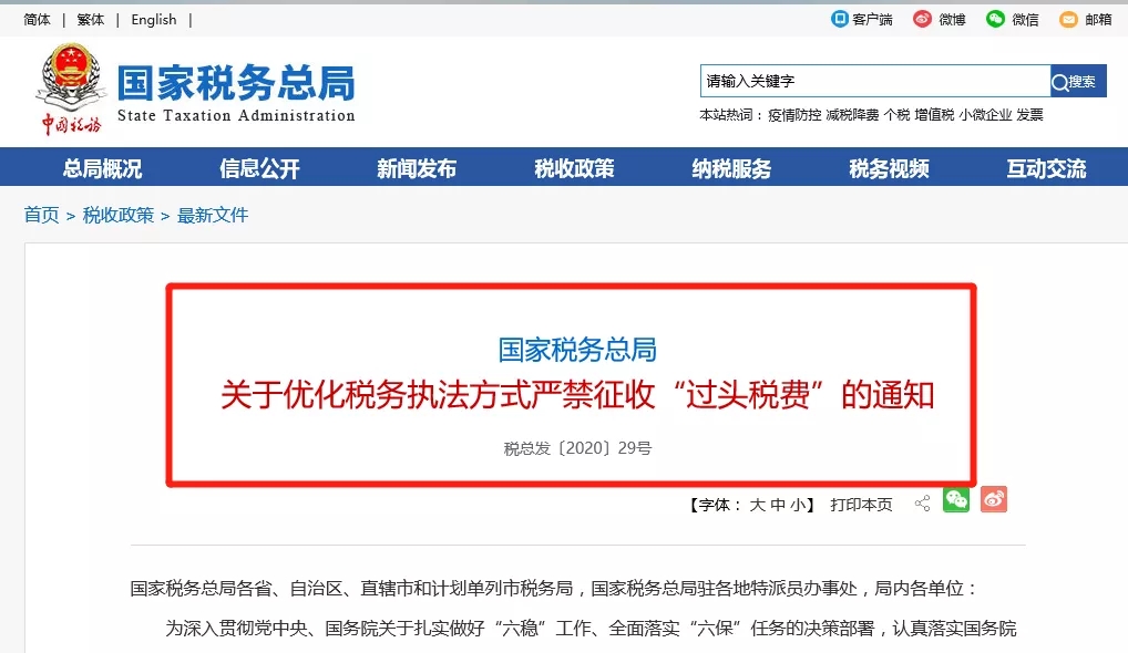 為深入貫徹黨中央、國務院關于扎實做好“六穩(wěn)”工作、全面落實“六保”任務的決策部署,認真落實國務院常務會議有關精神,進一步提升政治站位,充分發(fā)揮稅收職能作用,統(tǒng)籌推進疫情防控和支持經(jīng)濟社會發(fā)展,現(xiàn)就優(yōu)化稅務執(zhí)法方式、嚴禁征收“過頭稅費”有關要求進一步強調(diào)如下:
